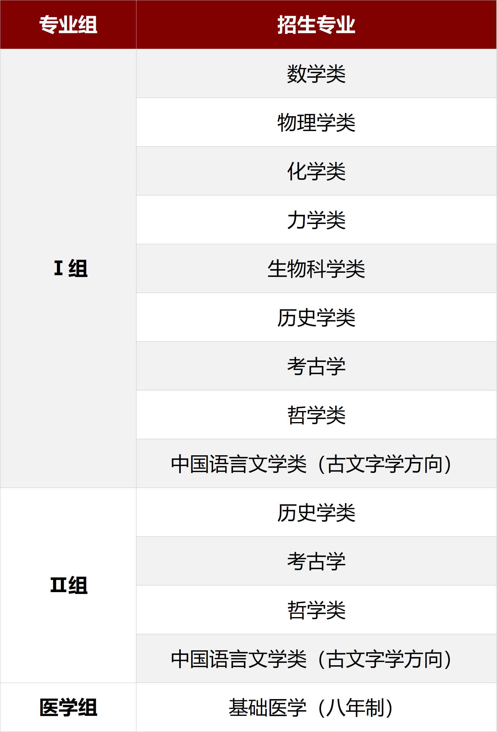 1. 学科基础素质考核:通过笔试着重考察学生学科基础能力,Ⅰ组和医学组笔试科目为:数学、物理、化学,Ⅱ组笔试科目为:语文、英语、历史。