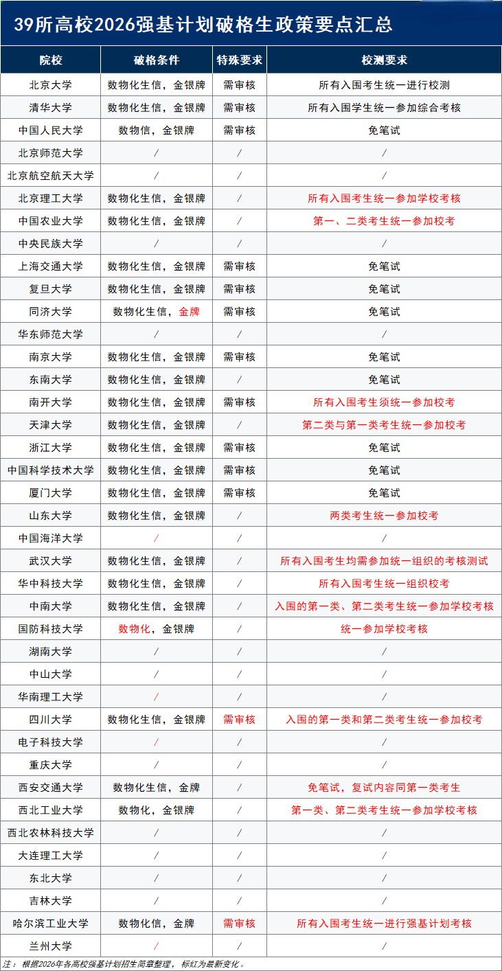 2026年各高校竞赛金银牌破格生政策要点汇总如下: