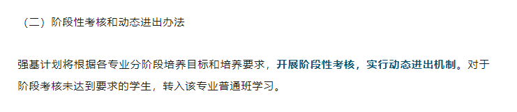 如哈尔滨工业大学,强基计划将根据各专业分阶段培养目标和培养要求,开展阶段性考核,实行动态进出机制。对于阶段考核未达到要求的学生,转入该专业普通班学习。