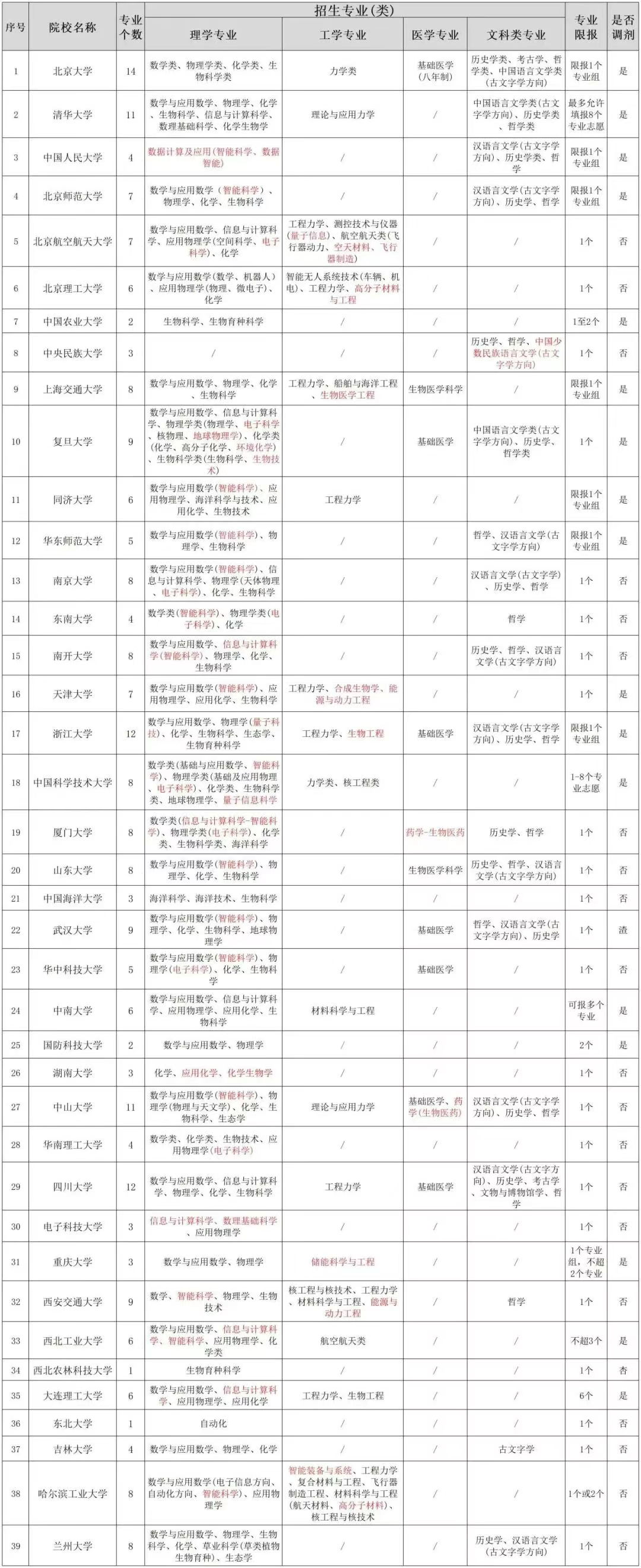 强基计划招生院校及专业方向汇总目前,参与高考强基计划招生的国内高校共计39所,全部来自985建设项目,招生院校格局层次基本趋于稳定,理工类、综合类、专业特色类大学都有,能满足不同科类学生的报考需求。