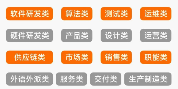 技术类:软件开发、技术运营、安全技术、测试与质量管理、技术研究、解决方案与服务、硬件开发;