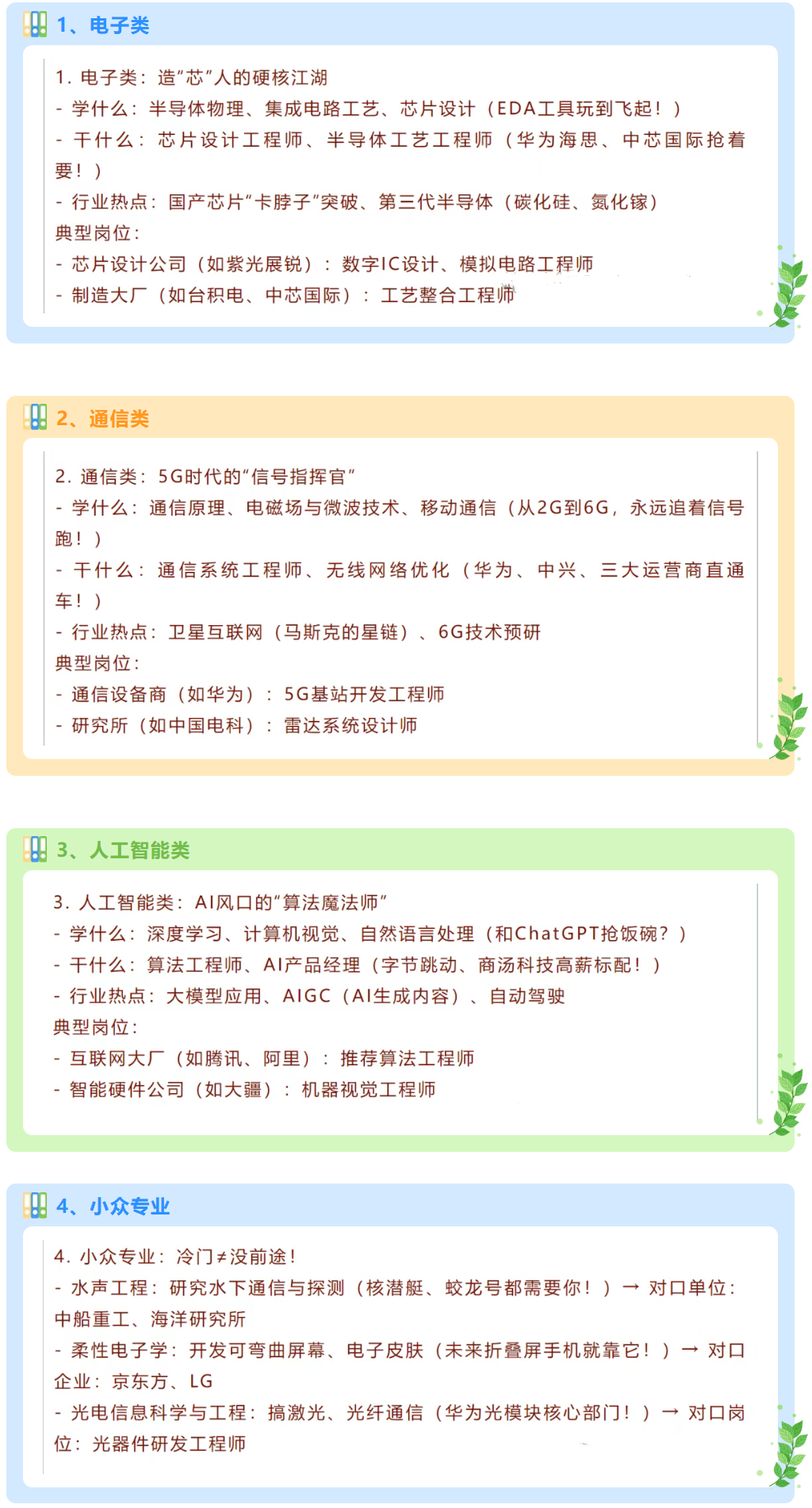 19.工业软件:新增交叉专业,融合软件工程、计算机技术与工业流程,专注工业大模型开发、工业软件研发,适合空间感好、热爱工业技术的考生。二电子信息类:22个专业方向,横跨硬件与通信传输