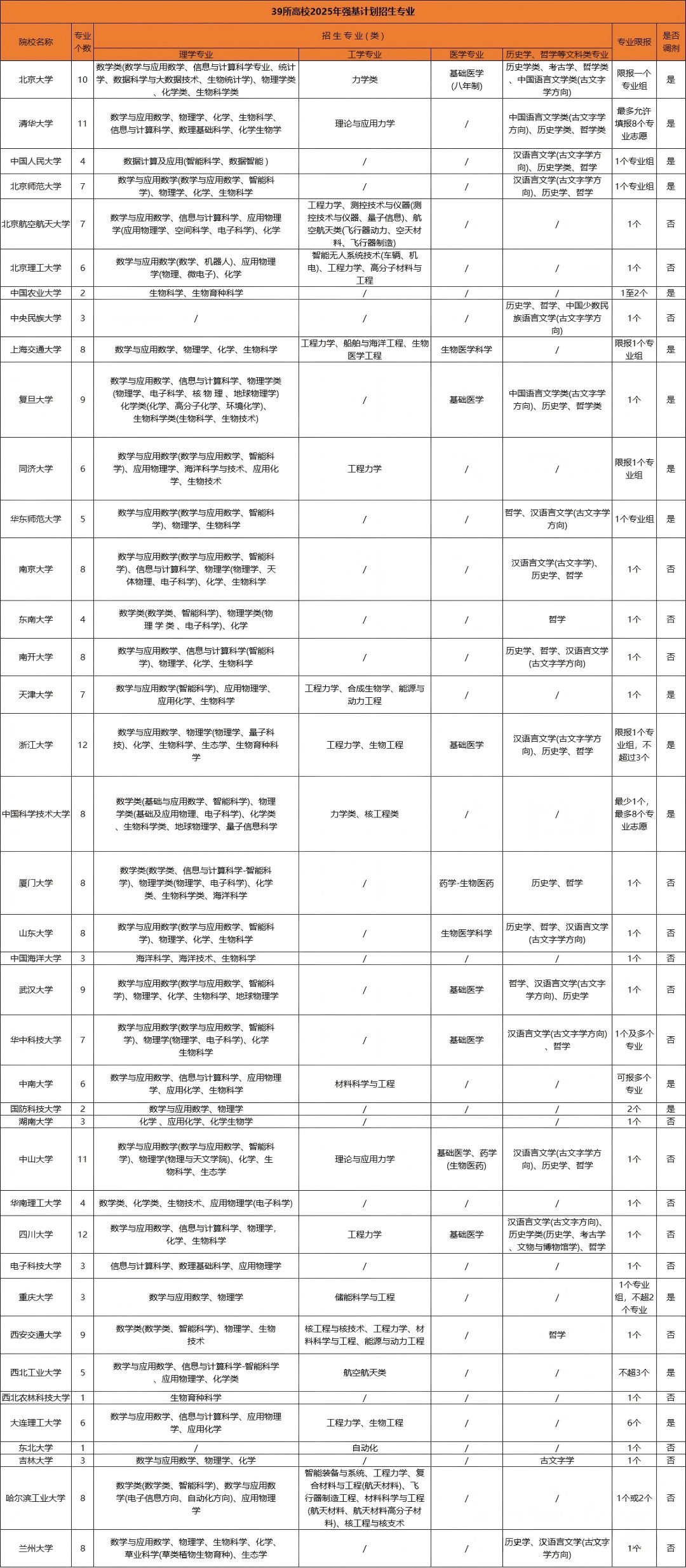 以下为39所高校强基招生专业仅供参考: