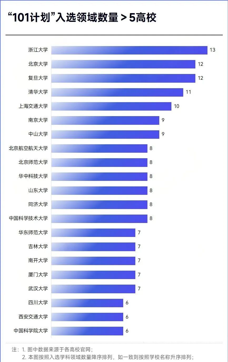 领跑者:浙大、北大、复旦“三足鼎立”浙江大学:以 13 个学科入选成为最大赢家,覆盖计算机、数学、生物科学等领域。秘诀在于它的 “交叉创新” 生态,比如人工智能与医学结合、量子科学与工程融合,刚好契合 “101 计划”的 “拔尖 + 交叉”理念。
